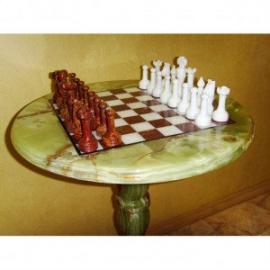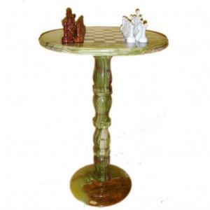 Высота около 60 см., диаметр столешницы около 40 см., вес комплекта около 15 кг. Цвет стола - зеленый оникс. Цвет шахматного поля и фигур - различные сочетания оникса, яшмы, мрамора. Нежное, элегантное изделие украсит любой интерьер.