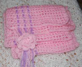 Нежнейший, легчайший, очень мягкий шарфик. Выполнен из Angora de Luxe. Украшен розовыми и сиреневыми вязаными шнурочками, на которые прикреплены "розочки". Размер 26 х 150 см, не считая украшения.