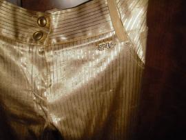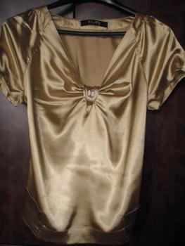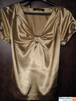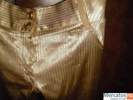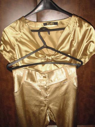 продаю стильный фирменный комплект шёлковые брючки и блузка.Размер 44.Цвет-золото.Брюки золотого цвета в золотою полоску с заниженной талией,с фуринитурой под золото,и фирменным логотипом из стразиков.Очень лёгкие и приятные к телу.Фирма Cinema Donna.Блузка так же золотого цвета,сборка в области груди,красивое декольте,рукава небольшими фонариками,сбоку на навидемой молнии.В реале всё смотрится намного интереснее!Куплено лично мною в Турции в фирменном магазине в мае.Одевала 1 раз на свадьбу!Торг..