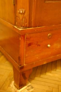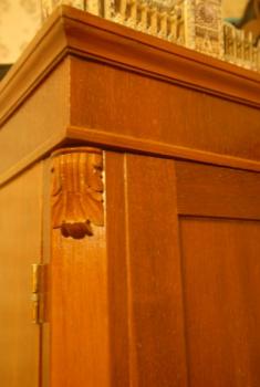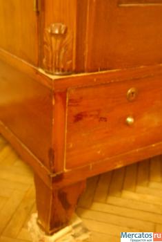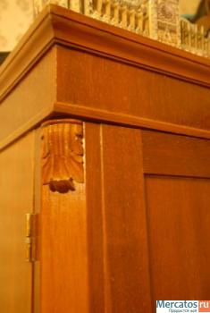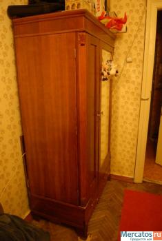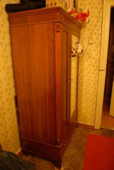 Шкаф платяной. Похоже, что частично монолит, но не уверена. 30-40-х годов примерно. С резными украшениями. Среднее состояние, но выглядит симпатично. Очень тяжелый. Есть отделение с полками и отделение для вешалок с одеждой.