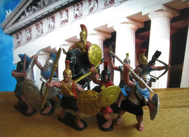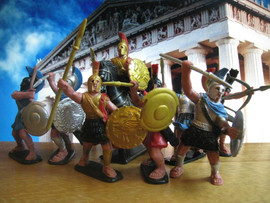 Набор окрашенных солдатиков в масштабе 1/32 (60 мм). Армия Александра Македонского. Из серии Александр Македонский. В набор входит 7 шт. пеших фигур и 1 конная фигура. Одна пешая фигура, так же может размещатся на лошади. Мягкий пластик. Набор без коробки. Комплектация №2. Всего существует 2 комплектации