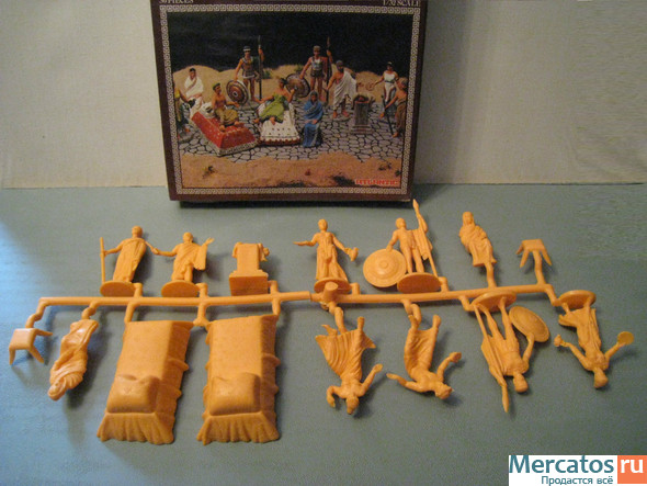 Набор солдатиков в масштабе 1/32. Производство Atlantic (Италия) 1604 Греческая знать. Жизнь на Акрополе. Полный набор, без повторов. Все фигуры на ЛИТНИКАХ, набор БЕЗ КОРОБКИ! Все позы и детали набора в наличии. Выпущен в далеком 1977 году. Цвет пластика-оранжевый. ОРИГИНАЛ!!! Фирма Atlantic больше не существует. Формы для изготовления набора утрачены. Отличное состояние фигур и коробки. Раритет!!!!! В каждой из тем древности, Атлантик изготовил по одному набору состоящих из гражданских лиц. По видимому этот набор отображает фестиваль.Было по крайней мере 60 крупных фестивалей в официальном Афинском году, плюс много менее важных, местных. Фестиваль был религиозным праздником, когда прославляли Богов и приносили им жертвы. Но большая часть фестивалей была посвящена и символизировала, парады и соревнования. В жертву приносили животных, а самый популярный способ предсказать будущее состоял в том, чтобы 'прочитать' его по внутренностям недавно пожертвованного животного. Жертвопрношение объясняется наличием жертвенного камня с выпотрошенным ягненком на нем. Есть также священник, который выпотрошил животное и тот кто, как ожидали бы, будет интерпретировать знаки. Скорее всего, мясо будет приготовлено и съедено поклонниками. Другие фигурки в этом наборе изображают людей, несущих обеденную посуду (возможно рабыня), и двух человек, откинувшихся на кроватях. У Греков часто проходил symposion, который был попойкой, и посещался только мужчинами. Однако в этом наборе одна из откинувшихся фигур - женщина. Наконец, есть вооруженный человек, возможно стоящий на страже во время церемонии.