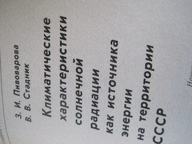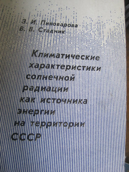Данное научно-справочное пособие "Климатические характеристики солнечной радиации как источника энергии на территории СССР" содержит обобщенные данные о солнечной радиации для всей территории СССР. В нём представлены таблицы и карты пространственно-временного распределения прямой и рассеянной солнечной радиации, суммарной радиации, продолжительности солнечного сияния.