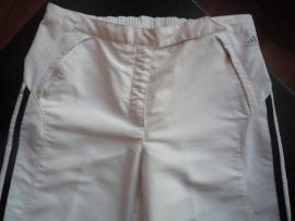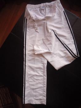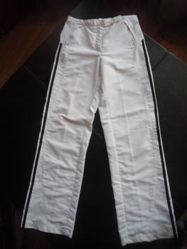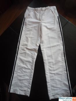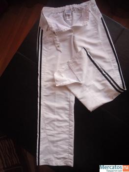 Спортивный костюм Adidas белого цвета, полосы по всей длине рукава и брючины - темно-синего цвета, куртка на молнии, брюки тоже на молнии, чистый размер - 36/44