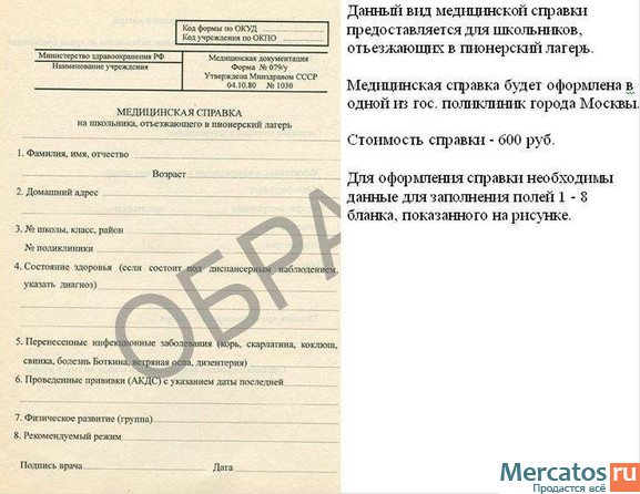 Справка для школьника в лагерь по форме 079у - 600р,