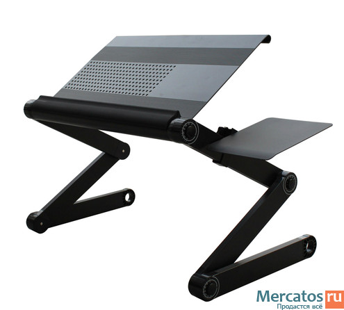 Столешница выполнена из алюминия, который обладает хорошей теплопроводностью. Кроме этого, для дополнительного отведения тепла выделяемого ноутбуком, в столешнице сделаны специальные отверстия. Столик не займет много места в Вашей квартире. В сложенном состоянии он имеет размеры 56х30х4 см и легко умещается под кроватью или креслом. Столик для ноутбука всегда можно взять с собой и наслаждаться комфортной работой в самых различных местах: на отдыхе, на даче, в поездке. Дети могут использовать его для лепки или рисования. Вес столика всего 2,3 кг. Максимальная высота – 51 см. Столик можно использовать не только для практически любой модели ноутбука( с размером экрана до 17 дюймов). На его панели можно расположить книгу, DVD-плеер, столик может служить подносом для еды, напитков и прочего. Столик новый, в красивой упаковке, с инструкцией на русском языке. Подставка для мыши в комплект не входит и может быть продана отдельно.
