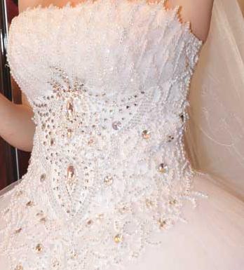 Платье цельное, верх расшит изящными хрустальными стразами. Низ платья из фатина мелкими кольцами. Платье плотно облегает фигуру. На спине шнуровка.