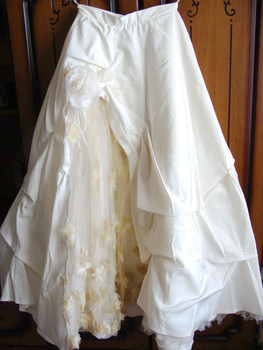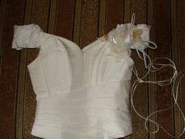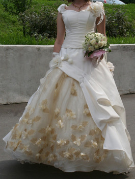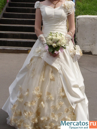 Срочно продаю шикарное свадебное платье нежно-кремового (бежевого) цвета р. 44-46 на рост от 165 см на каблуки. Платье раздельное: корсет с цветком, пышная юбка сборками с оригинальной вставкой из органзы, с листочками и цветами, перчатки с кружевным рисунком до локтя, сумочка. Покупала в свадебном салоне. Отдаю намного дешевле - цена за платье, перчатки 9500 руб., смотрится дорого. В подарок отдам чехол для платья и сумочку.Платье хранилось очень бережно. В этом необычайно красивом платье Вы будете как принцесса. Вышлю при необходимости фото на почту.