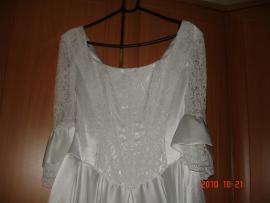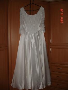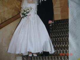 Свадебное платье белого цвета 42-44 размера. Вверх отделан кружевом, низ - атласная пышная юбка. Рукав 3/4, кружевной. Глубокое декольте. Очень красивое платье. Одевалось один раз. В идеальном состоянии, после химчистки. Подъюбник с двумя кольцами отдам вместе с платьем.