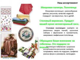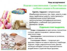 Здравствуйте!Приглашаем Вас окунуться в мир сладких снов.Засыпать и просыпаться на цветочной поляне среди пестрых бабочек и разноцветных птиц, под ветвями цветущей сакуры,ощутить на своей коже ласку теплого моря и полюбоваться тропическими рыбками. Огромный выбор расцветок,все размеры и высококачественные натуральные ткани.В наших каталогах Вы найдете замечательные подарки себе и своим близким на любые праздники.(продукция производства Иваново.Возможна работа или доп.заработок)Доставка на дом бесплатно!!!!! Подробности здесь