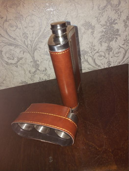 Подарочная Фляга из нержавеющей стали в коричневой коже с гербом РФ в одном тоне с цветом кожаного футляра * внутри три стопочки - стаканчика * высота фляги 16 см ширина 9.5 см толщина 2 см * новая * снаружи герб России под цвет кожи /не аляписто/* stainless steel * 10 oz * ~ 300 мл * фляжка в коричневой коже * смотрится стильно * подарили лежит не используется *