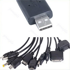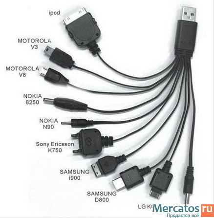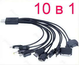 Универсальный зарядный кабель для телефонов, 10 наиболее популярных типов разъёмов питания. Заряжать можно от любого USB порта сразу несколько телефонов или от сетевого 220В зарядного устройства.