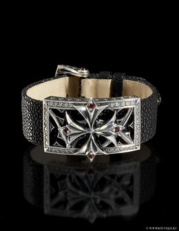 Браслет SoulFetish “Belfort” выполнен вручную из кожи ската черного цвета и дополнен металлической пряжкой с инкрустацией цирконами и гранатами. К модели прилагается фирменный текстильный мешочек. Модель подойдет как для мужчин, так и для женщин.