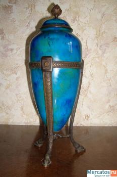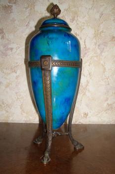 МУЗЕЙНАЯ ВЕЩЬ. Уникальная по редкости и красоте ваза (урна) монуфактры Севр. Начало ХХ – ого века (приблизительно 1905 -1908 г.). Высота - 38 см. На крышке имеется подглазурная клеймо «М Р» «SEVRES». Состояние идеальное. Фотография не может передать бесподобную имитацию голубой бирюзы с золотыми вкраплениями в сочетании с великолепной и очень элегантной отделкой бронзового треножника.