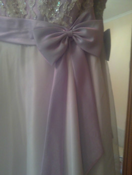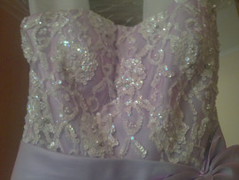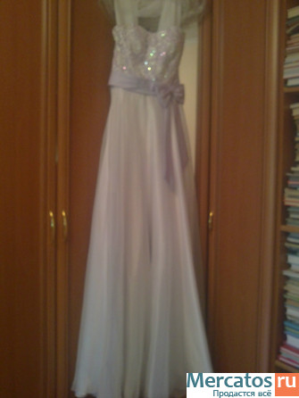 Вечернее платье в пол. верх-корсет нежно-сиреневого цвета,расшитые паетками. юбка белая. на талии сиреневый бант сбоку