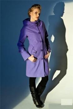 Модель средней длины около 95 см. Центральная застежка на крупные пуговицы. Капюшон в снятом виде похож на воротник с небольшими складками. Мягкая линия плеча. Длина рукавов регулируется отворотами. Модель очень украшают небычные карманы каплевидной формы с небольшими патами. Декоративные хлястики также расположены по низу рукавов. На верхней части спинки расположена отрезная кокетка, а на нижней шлица.