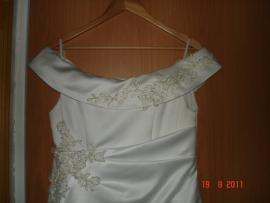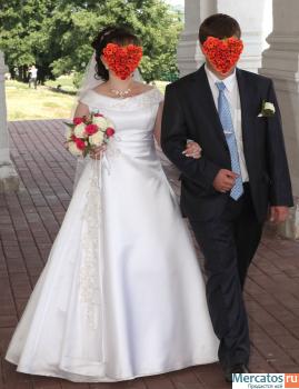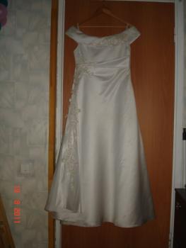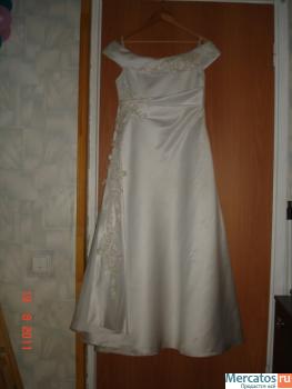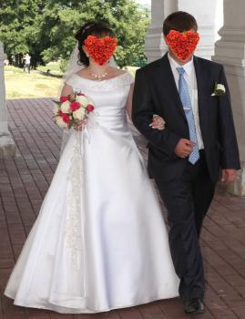 Продаётся свадебное платье с узорами под золото - размер 48-50, рост 158, подъюбник - 3 кольца - 15000р (новое покупали за 25), очень удобное. Стиль - А - силуэт (принцесса). Вместе с платьем отдаём сумочку (не использовалась) и перчатки. Использовалось один раз в хорошую погоду - состояние нового платья (нигде не порвано, не потёрто, не испачкано - после химчистки). Ткань достаточно плотная. Если будет что-то нужно, то жена всё расскажет.