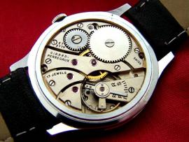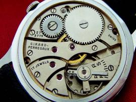 * Механизм - механика; разрабатывался для армии, так называемый Wehrmachtswerk часы с такими механизмами поставлялись по военному заказу Германии, калибр Girard-Perregaux 27 (на основе калибра AS 1130), функции - часавая, минутная и маленькая секундная стрелки; частота колебаний боланса f = 18000 A/h; запас хода 38 часов; размер механизма - диаметр 29 мм, высота 3,8 мм; 17 камней; замечательное состояние, прошел предпродажное обслуживание, сохраняет плавный, точный и надежный ход; Подписан - GIRARD-PERREGAUX, 17 JEWELS; Серийный номер - №27 3779 (45 год), Swiss, оригинальные клейма.