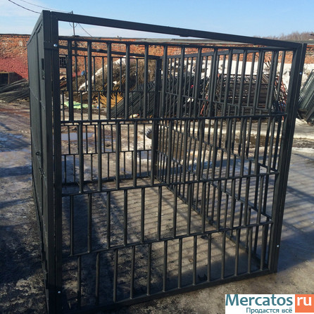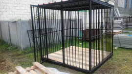 Вольер выполнен из прутьев, каркас из швеллера 50*100*50, прутья D16-18, профиль 50*25, высота около 2м, ширина 2м, длина не более 6 м.
