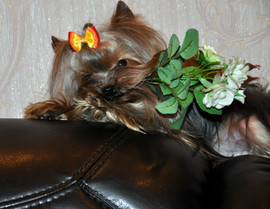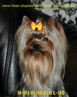 Питомник предлагает для вязки шикарного кобеля йоркширского терьера, вес 1,5 кг, яркий, шёлковая шерсть, курносый, с очень хорошим положительным характером, достойная родословная РКФ, выставочный дипломом РКФ, кукольная мордочка, прикус N 6*6 , развязан и проверен по потомству, передает своим детям мордочки беби-фейс и миниатюрность. От него рождаются очень красивые щеночки. Вяжет самостоятельно, имеет неоднократный опыт вязки крупных сук. Здесь можно посмотреть родословную