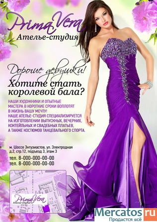 Ателье-студия ПримаВэра предлагает индивидуальный пошив выпускных, вечерних, свадебных платьев, повседневной одежды, а также костюмов для спортивных бальных танцев, художественной гимнастики, фигурного катания, рок-н-ролла, джаз-модерна, костюмов для шоу программ.