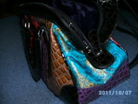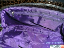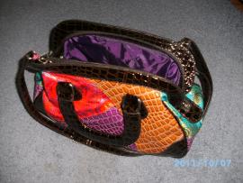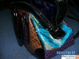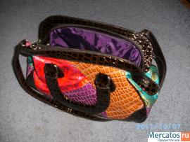 Яркая,модная,стильная.Основное отделение на молнии,на подкладке,внутренний карман на молнии,карман для мобильного телефона.Искусственная кожа,вставки из материала "под кожу рептилии".Из Германии.