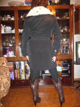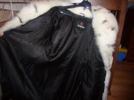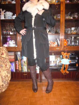 Очень красивый воротник из писца, подстежка - кролик. Материал - не промокаемый и не продуваемый(типа плащёвки, но матовый,плотный) на рост 164-175 (мой рост164 и мне см.10 до колена.)