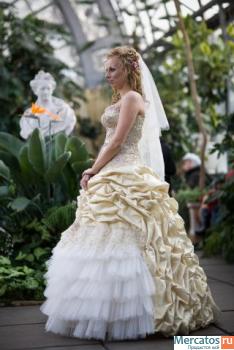 Обалденное свадебное платье золотого цвета,выполненное под заказ.В идеальном состоянии - Одевалось только на первый танец,т.к. было второе.р-р 44-46,расшитое стразами и стеклярусом. Покупалось за 46т.р.При желании туфли,кринолин,перчатки в подарок.Возможен разумный торг.