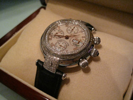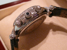 Корпус: белое золото, диаметр 40,0 мм, толщина 14,5 мм, сапфировое стекло, инкрустирован вручную бриллиантами (2 кольца бриллиантов и крепежи из бриллиантов), сапфир в заводной головке, на крышке герб, перламутр внутри, 47 гр. белого золота.