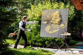 Уже сбились с ног в поиске оригинального подарка имениннику? Galitsyna Art Group уже решила Вашу проблему – Звездное шоу. Более креативного подарка придумать невозможно. Звездное шоу – это шоу в котором на глазах у зрителей будет создаваться картина, но процесс создания будет очень загадочным. Во-первых, на протяжении всего номера полотно будет динамично вращаться перед зрителями, а во-вторых – художник будет рисовать невидимыми красками. Ваши гости будут все шоу пытаться предугадать, что же будет в конце. Согласитесь, интрига ведь захватывает. А в финале наш артист бросит на полотно много-много золотых блесток, и все увидят готовую картину, которая останется в подарок имениннику или же молодоженам.