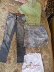 | 1.Джинсы зауженные.2.Юбка "под джинсу" 3.Зеленая футболка.4.Новая футболка "Снуппи".
