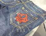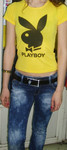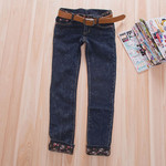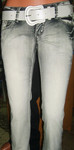 | Джинсы синие, строчка желтой ниткой, с поясом. |