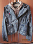 | Джинсовка, размер L. Из вареной джинсы. Внутри кофта-обманка с капюшоном. Б/у 1 лето и полосени. |