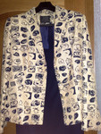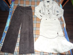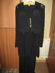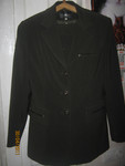 | Костюм темно-синий: пиджак темно-золотой с синим, юбка темно-миняя прямая с разрезом с зади, топ светло-жолтый. все 100% полиэстер. Покупала на свадьбу сыну, одела один раз. В идеальном состоянии. |