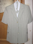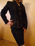 | Джинсовый, с тонкой полоской.Пиджак, юбка, жилет, галстук, блузка.Все новое. |