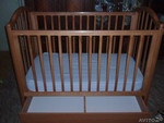 | Кроватка "Наша мама" светлого дерева, с ящиком и качалкой.Матрас кокосовой стружки, белье и подушки в подарок. Все в отличном состоянии. |