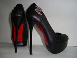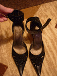 | Черные туфли на высоком каблуке из натуральной пресованной кожи.С замшевым ремешком на щиколотке с черными стразками... |